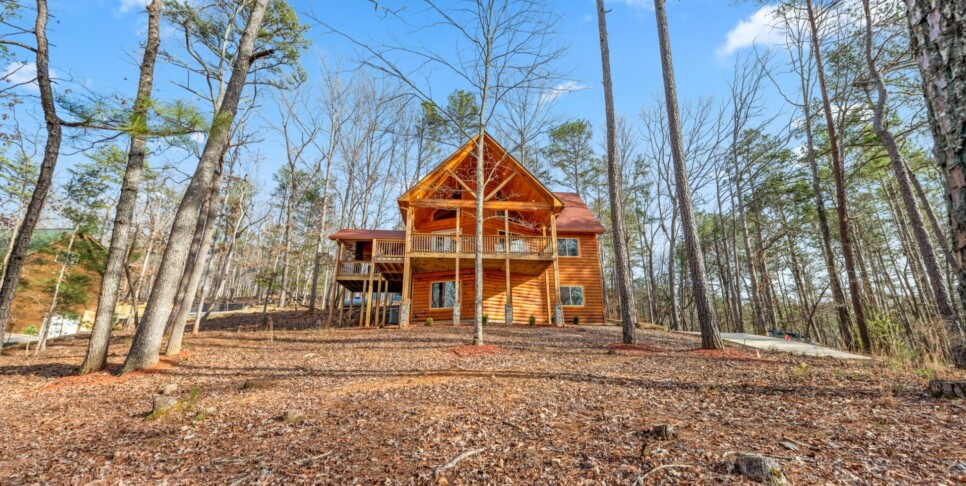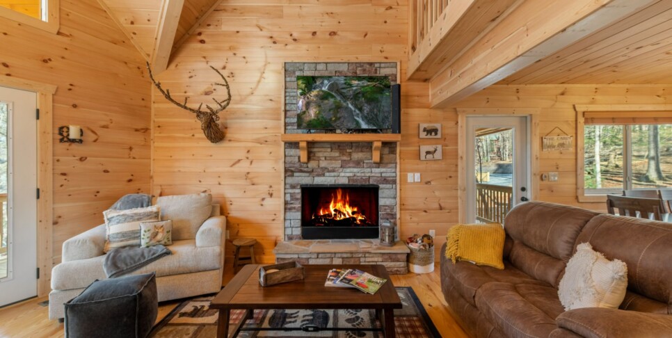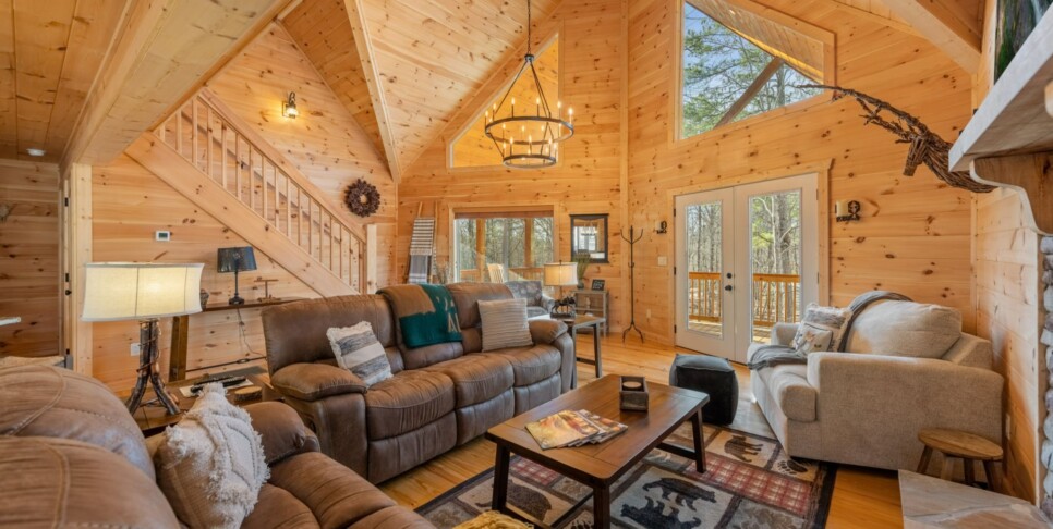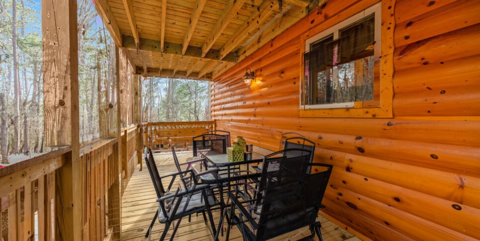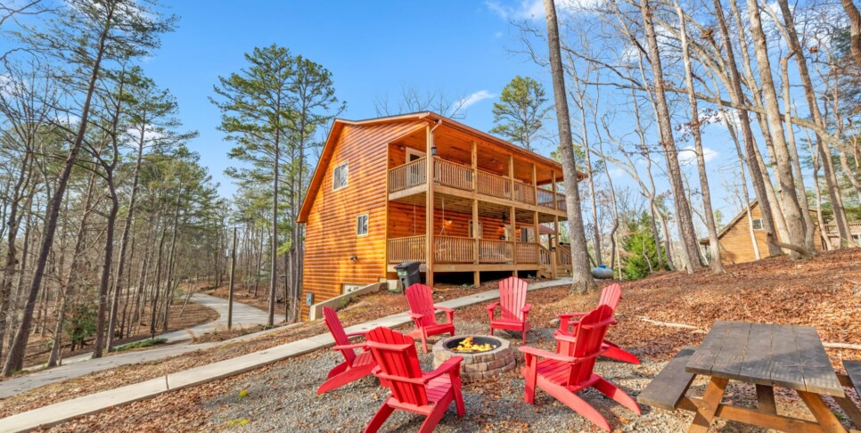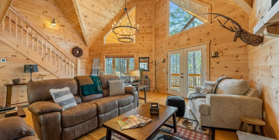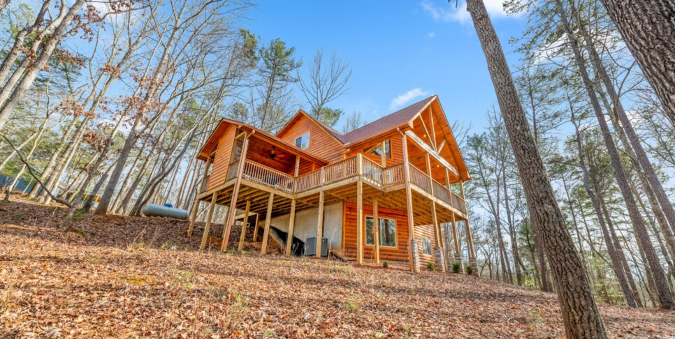 This 3-bedroom, 3-bathroom Ellijay, Georgia, vacation rental has a fully equipped kitchen, classic log charm, rocking chairs, a balcony off the main suite, a nice outdoor lounge, and the comforts of home. Pack your bags and head to the mountains of North Georgia for a fun family vacation or a getaway with some friends at Bucks Bear Lodge!