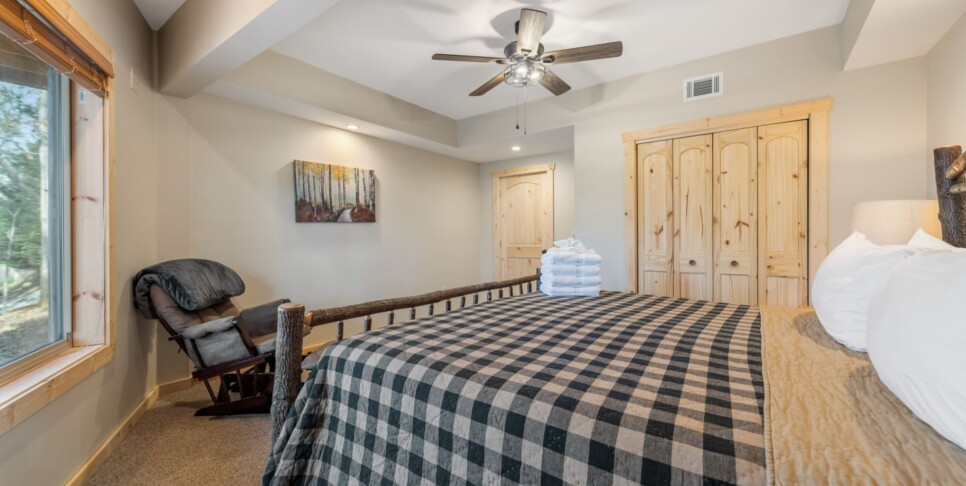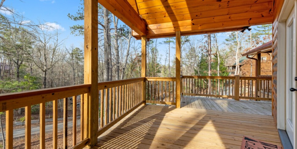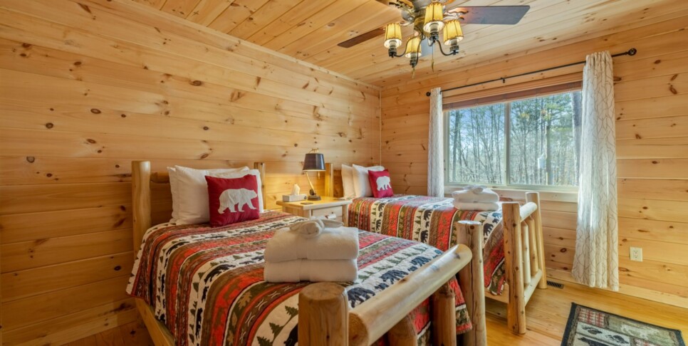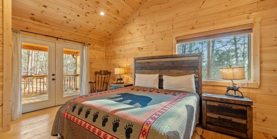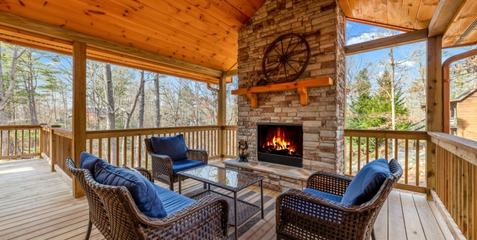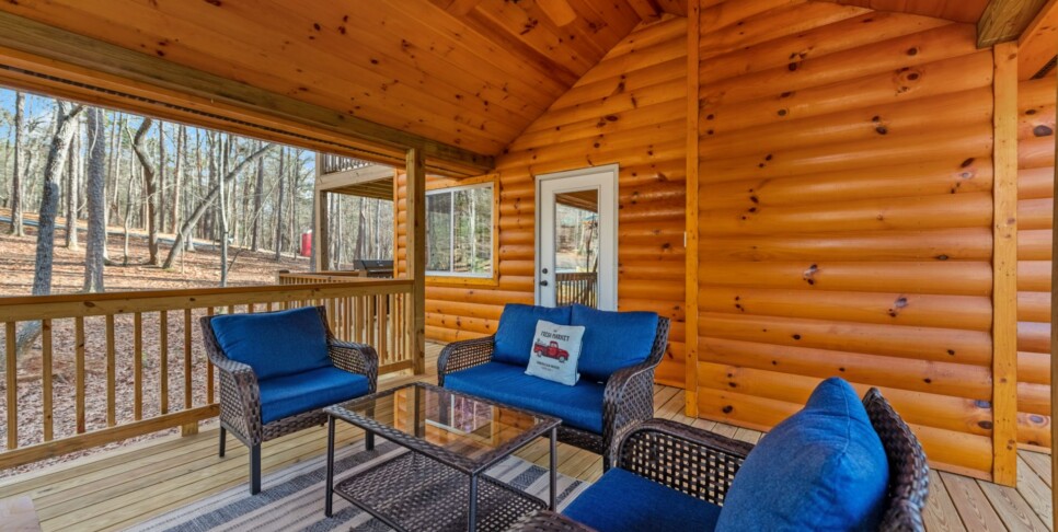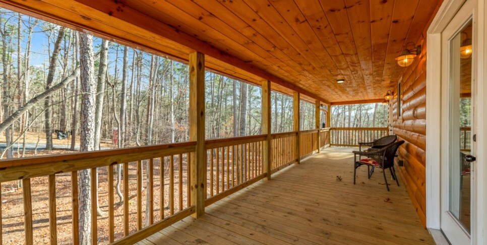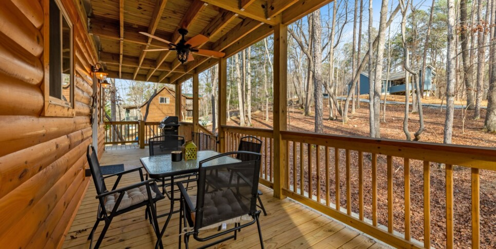 This 3-bedroom, 3-bathroom Ellijay, Georgia, vacation rental has a fully equipped kitchen, classic log charm, rocking chairs, a balcony off the main suite, a nice outdoor lounge, and the comforts of home. Pack your bags and head to the mountains of North Georgia for a fun family vacation or a getaway with some friends at Bucks Bear Lodge!