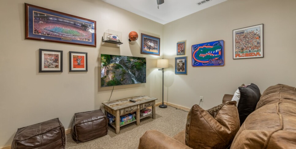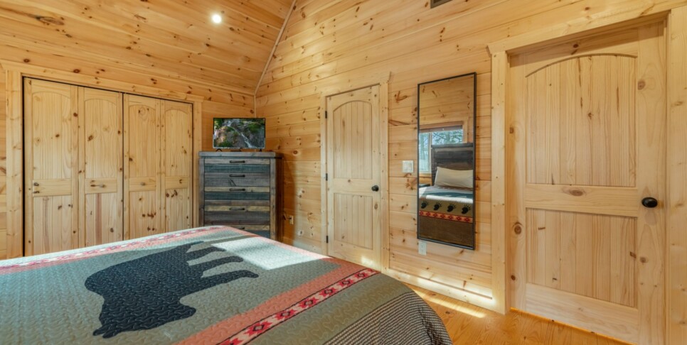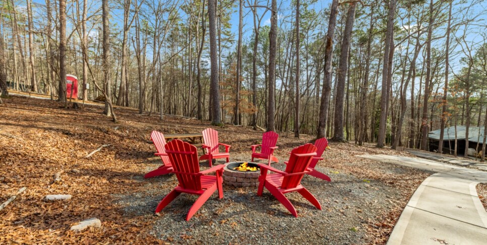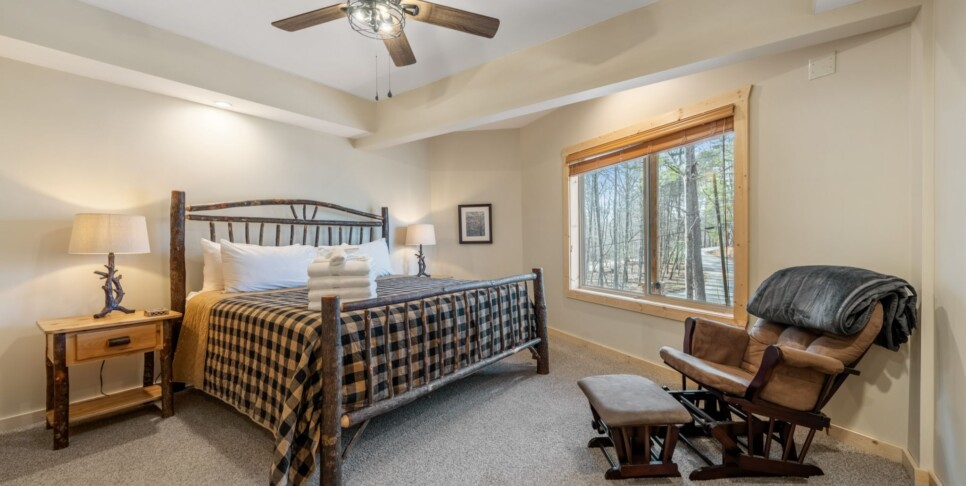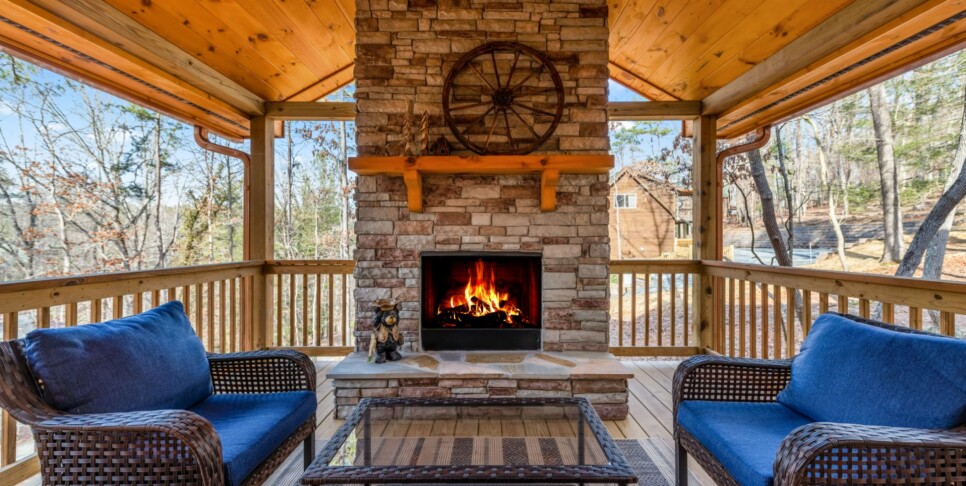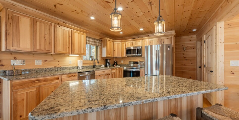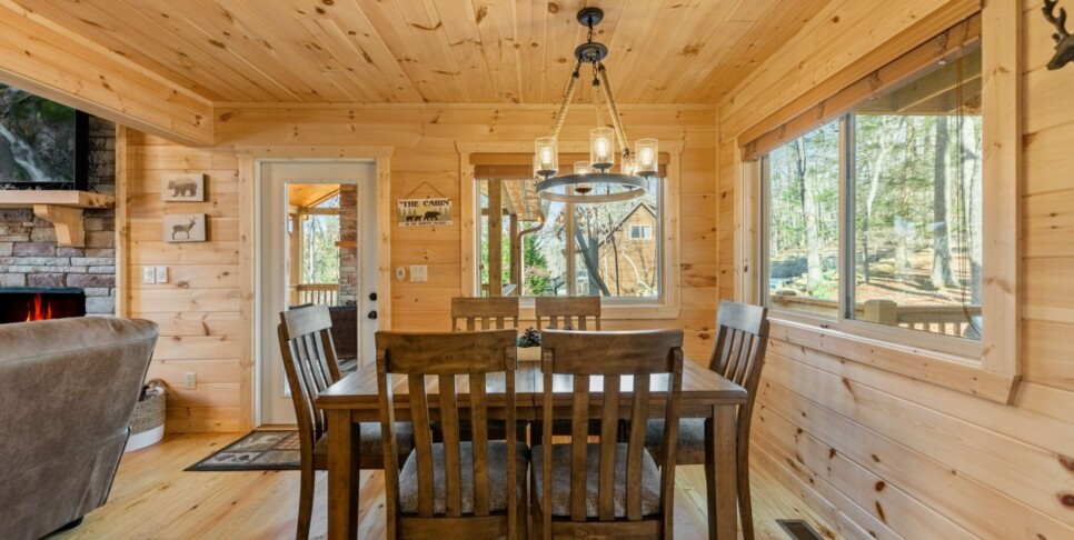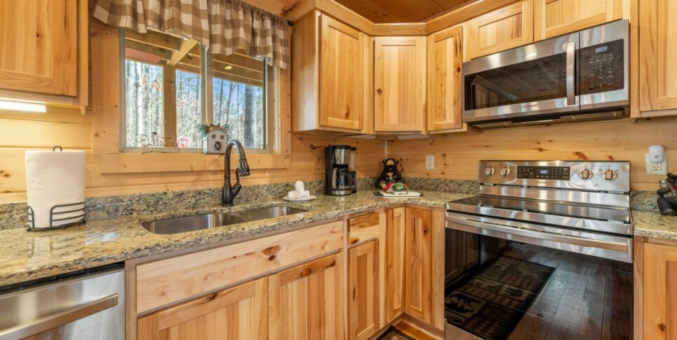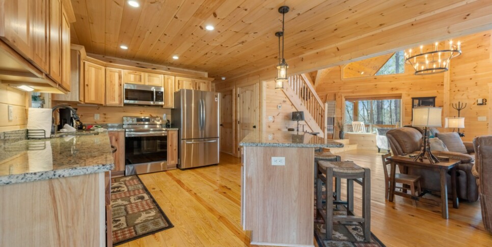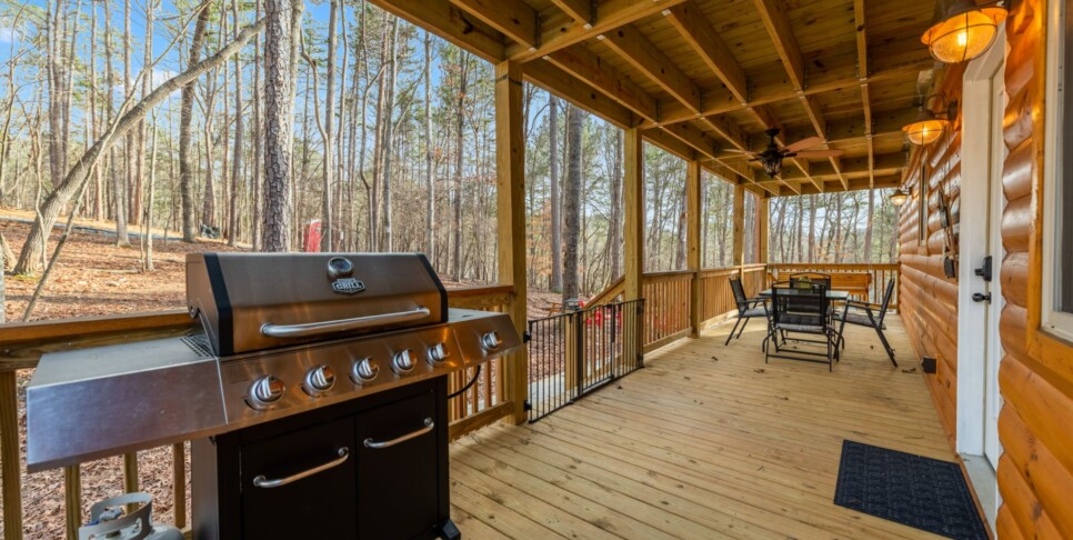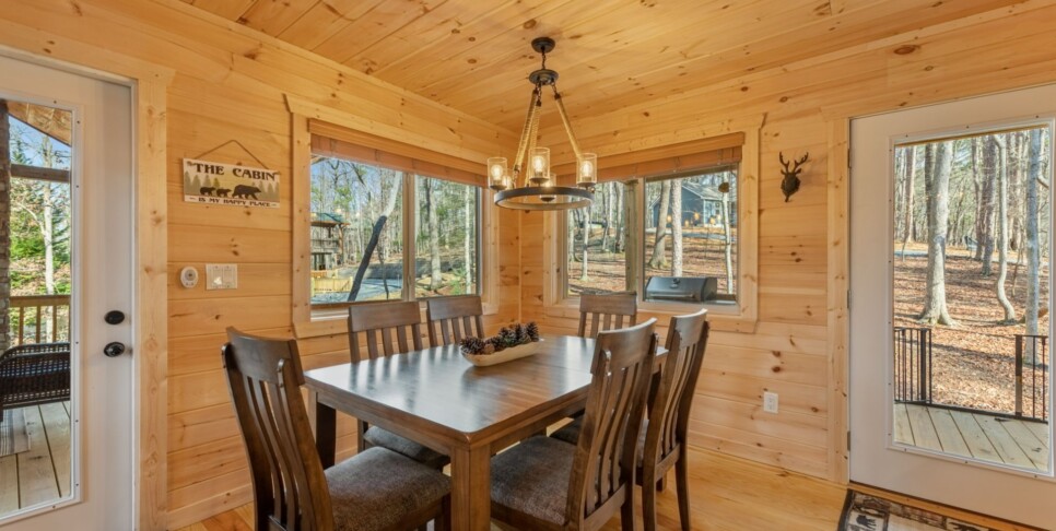 Start your day with fresh brewed coffee and a hearty breakfast made in the fully equipped kitchen – featuring granite counters, a breakfast bar, and a nice dining table at your Ellijay cabin rental. In the afternoons, toss burgers on the grill for lunch or make s’mores around the firepit! You can unwind on the porch swing, relax in the rocking chairs, watch TV by the fireplace inside, or head to the community pools in the Coosawattee River Resort.
