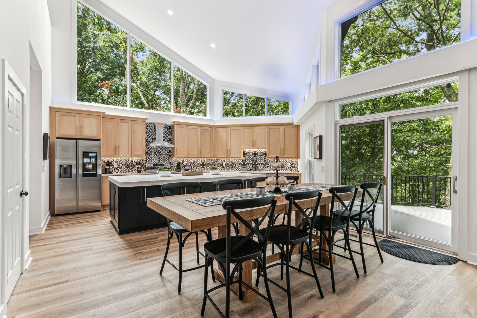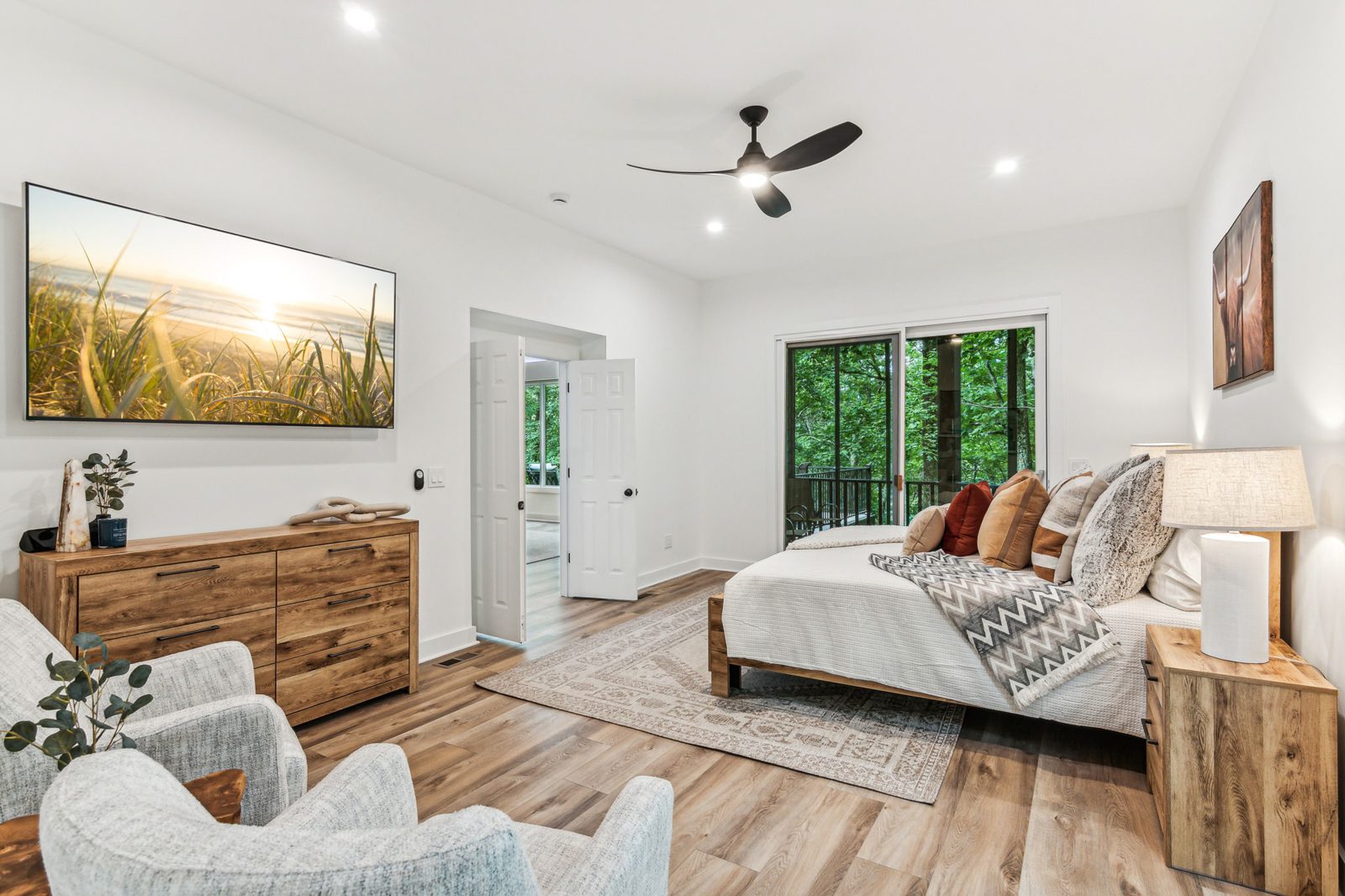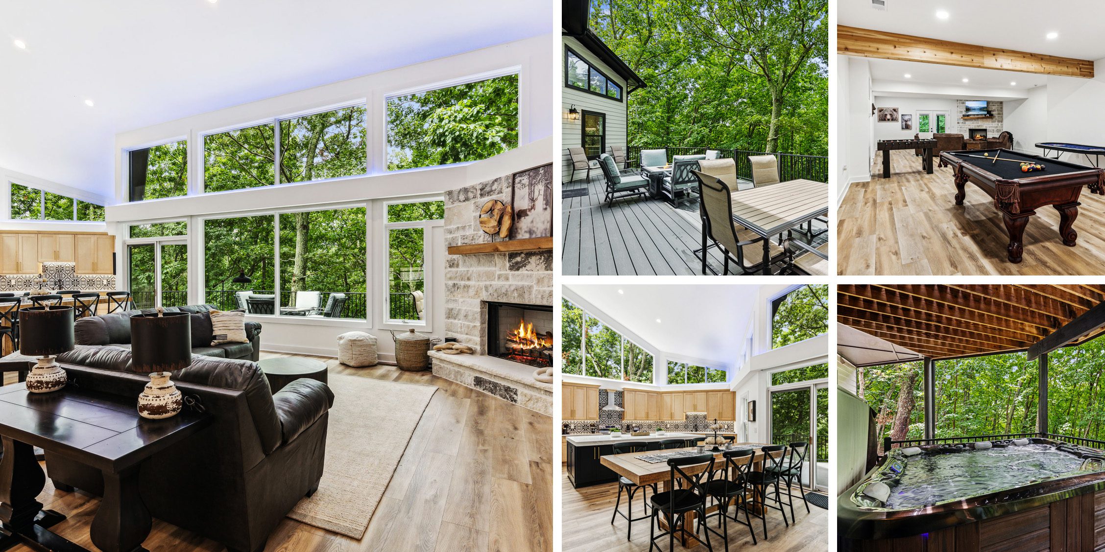 Step inside to a bright, open-concept living space framed by a stunning wall of windows that showcase peaceful wooded views. Cook with ease in the fully equipped kitchen featuring generous counter space and seamless flow into the dining and living areas so no one misses a moment. Stream your favorite shows, connect over board games, and enjoy thoughtful extras like high-speed Wi-Fi, TVs in the bedrooms, a washer and dryer, and seasonal Christmas décor that adds warmth to your mountain retreat during winter stays.