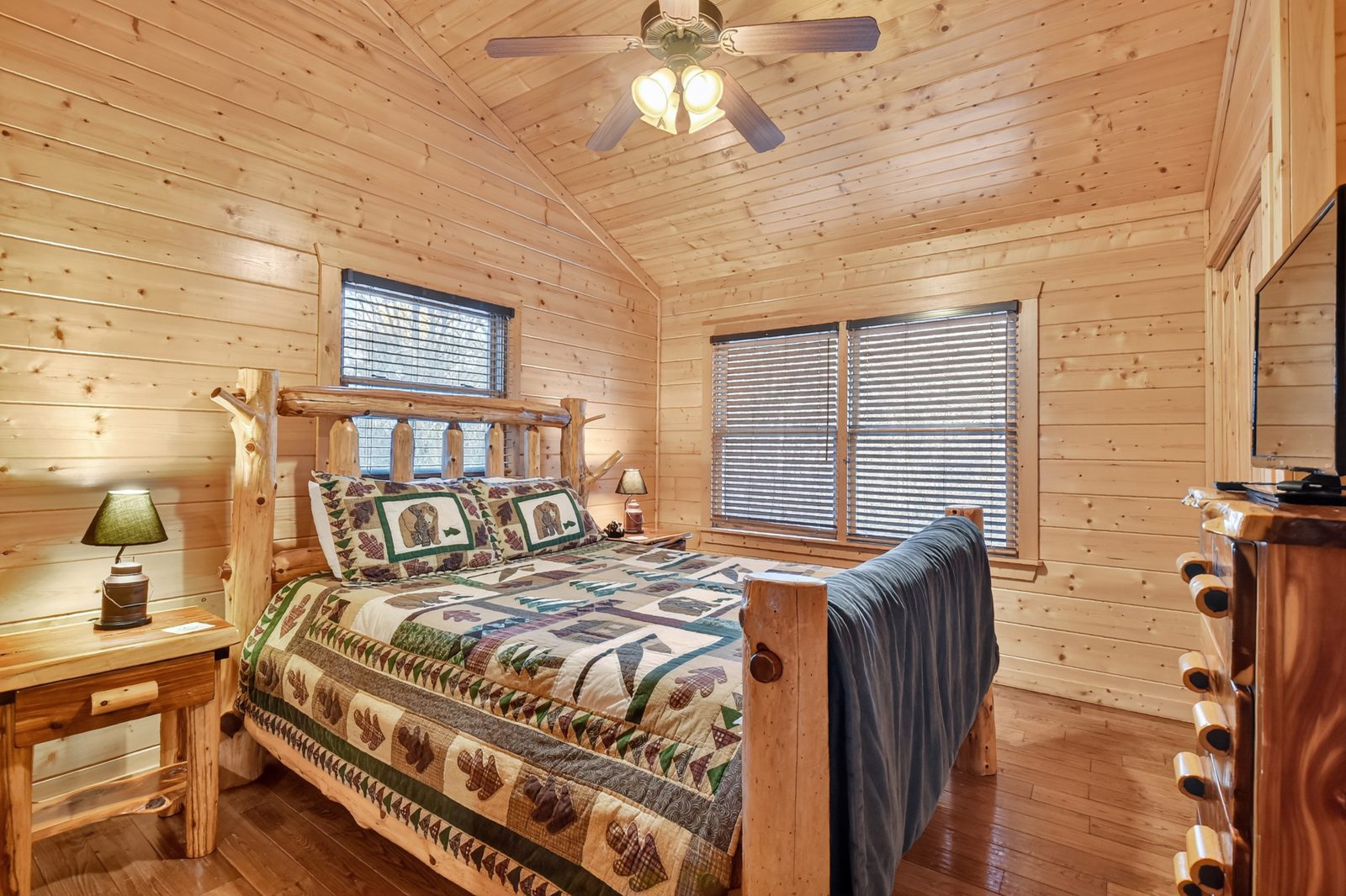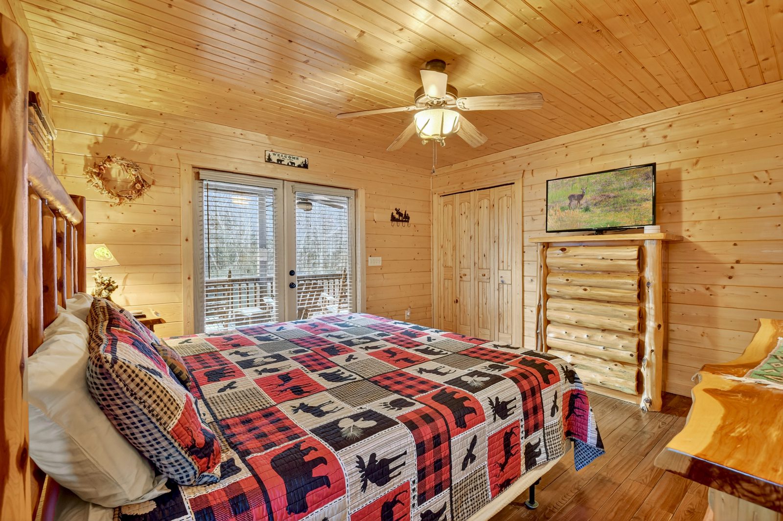 For more fun and relaxation, dip your toes in the water, launch a few floats, or cast a line. On the covered porch, unwind with a good book while the kids play horseshoes, badminton, or volleyball in the yard. On the wraparound deck, slip into the bubbling hot tub for soothing soaks or set up cornhole for more outdoor games. You can even light the firepit for s’mores under the stars! Attached to the primary suite, a private balcony offers rocking chairs to take in the fresh mountain air and gorgeous vistas whenever you like. Bonus: this suite even has a private bathroom with an indoor jetted tub for spa baths.