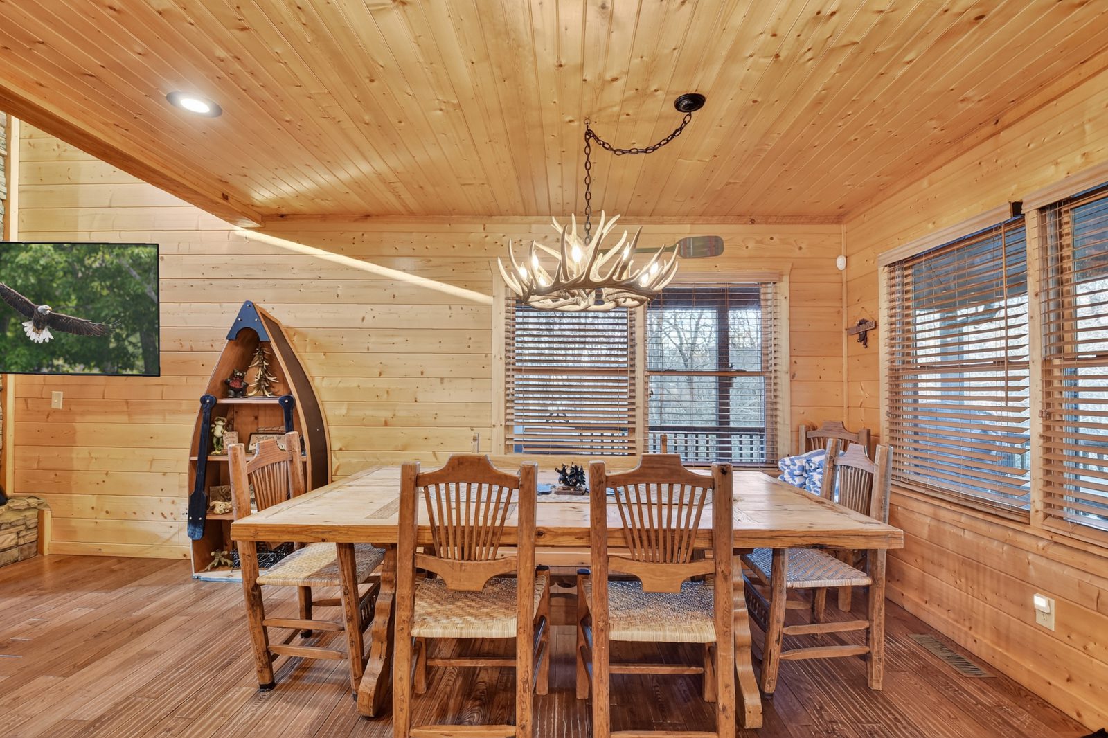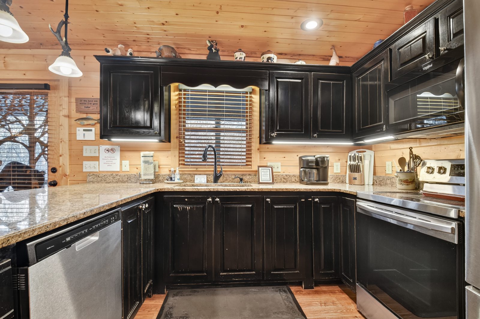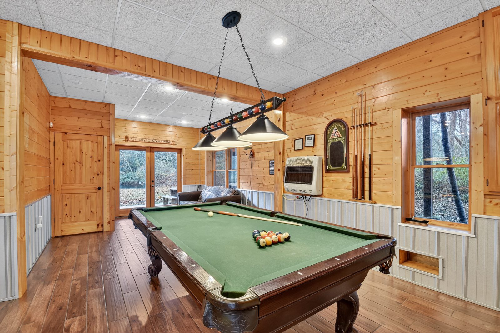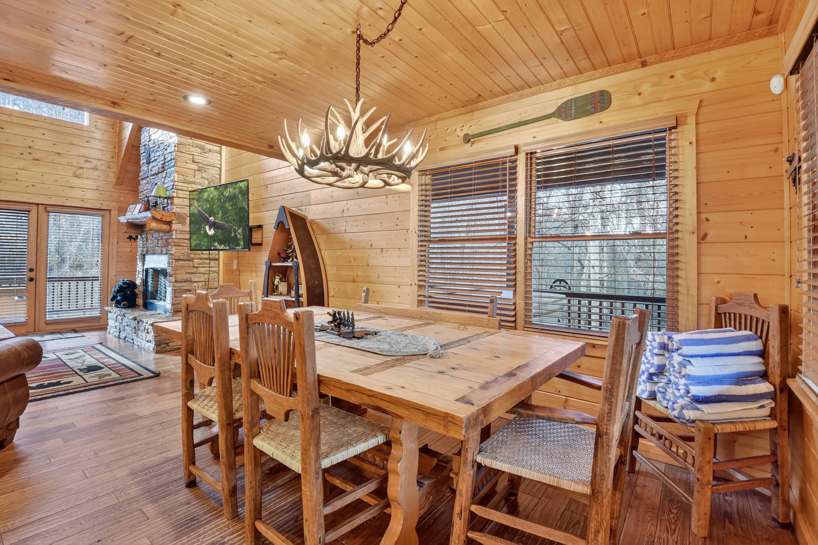 Light the wood-burning fireplace in the living room, primary suite, or on the main deck for cozier moments together, paired best with mugs of cocoa or glasses of wine. Stream movies on the big screen TV or head to the game room for rounds at the pool table or arcade unit; there’s even a wet bar for craft cocktails! Hungry? Whip up meals in the fully equipped kitchen that features a dual coffeemaker or toss steaks and veggie kabobs on the gas grill outside. Meals at the rustic picnic tables ovrelooking the water are memorable, indeed.