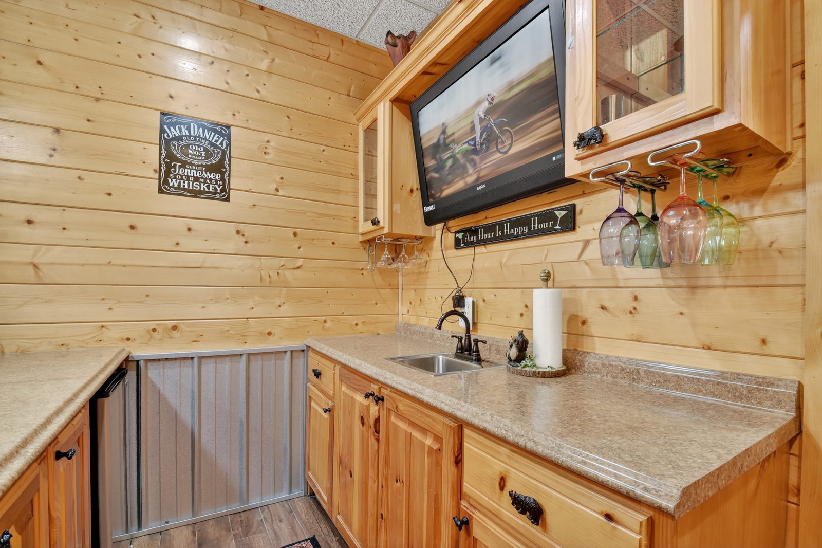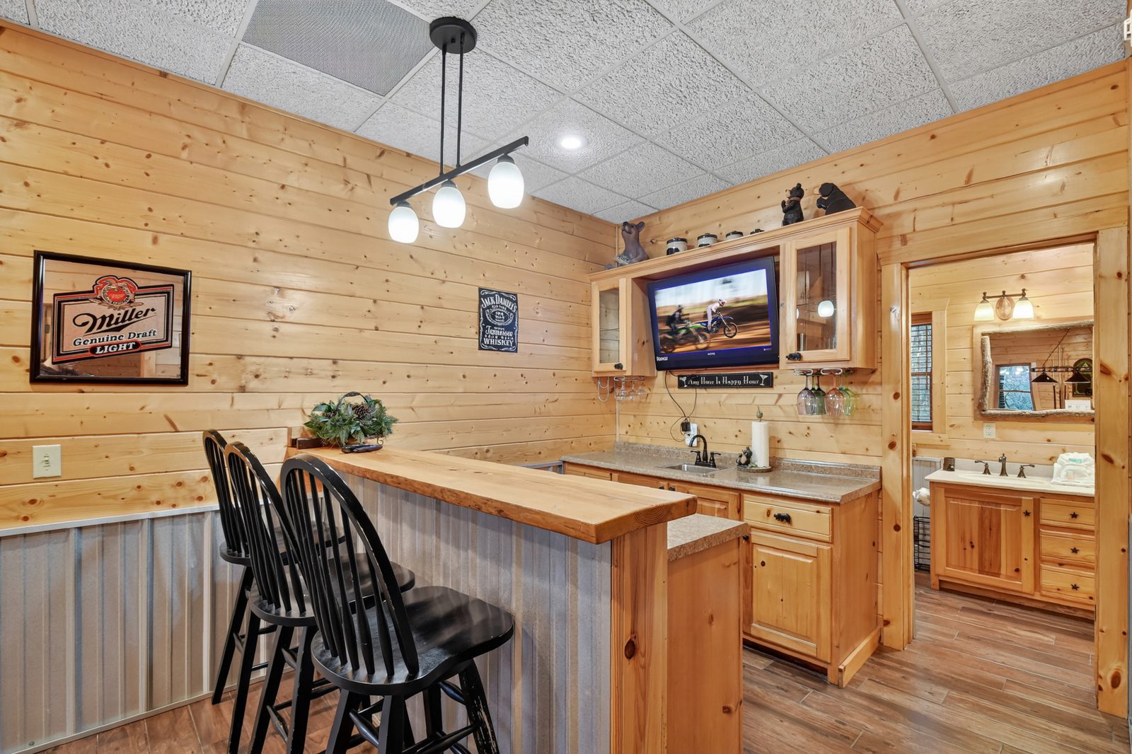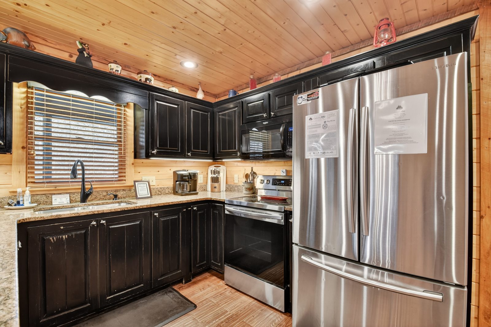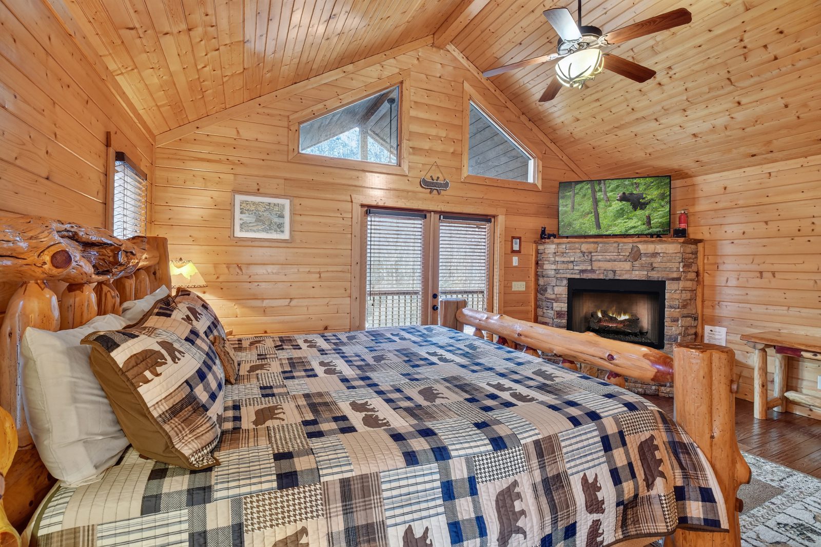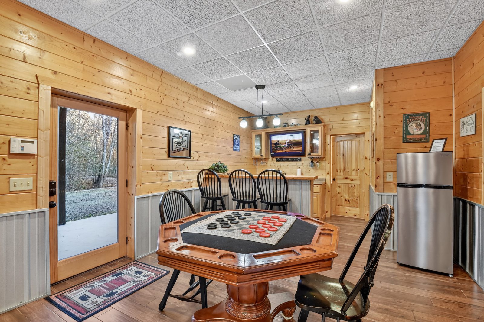 Light the wood-burning fireplace in the living room, primary suite, or on the main deck for cozier moments together, paired best with mugs of cocoa or glasses of wine. Stream movies on the big screen TV or head to the game room for rounds at the pool table or arcade unit; there’s even a wet bar for craft cocktails! Hungry? Whip up meals in the fully equipped kitchen that features a dual coffeemaker or toss steaks and veggie kabobs on the gas grill outside. Meals at the rustic picnic tables ovrelooking the water are memorable, indeed.