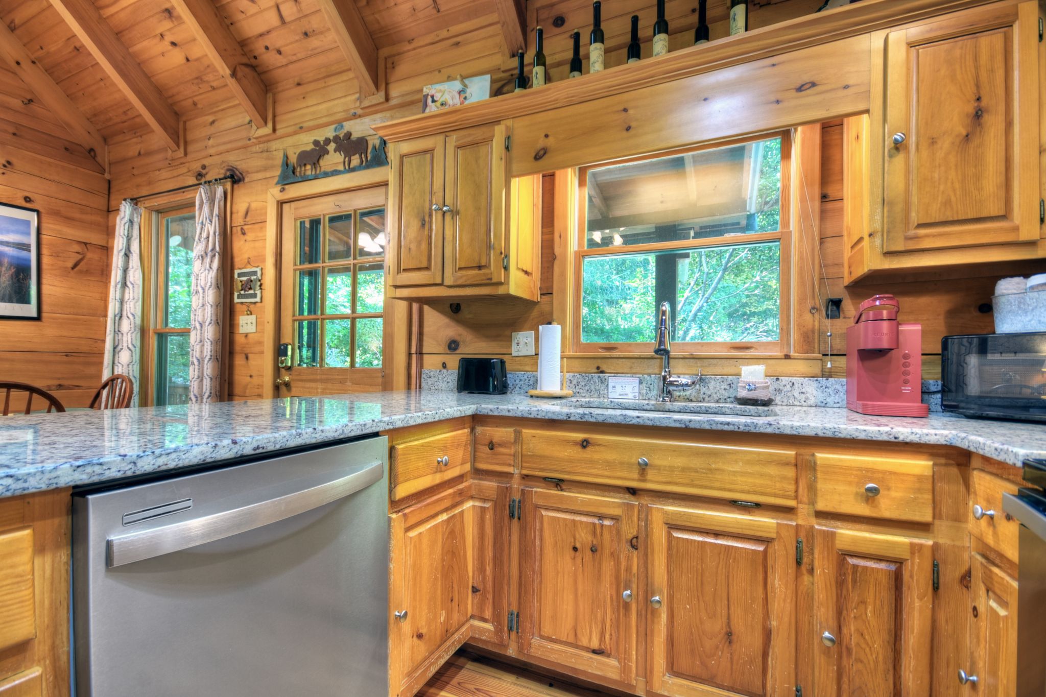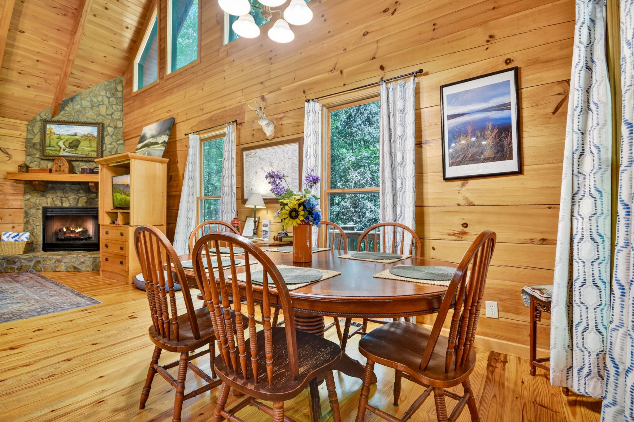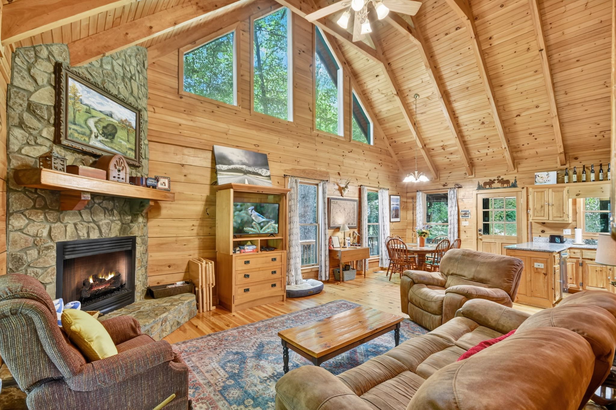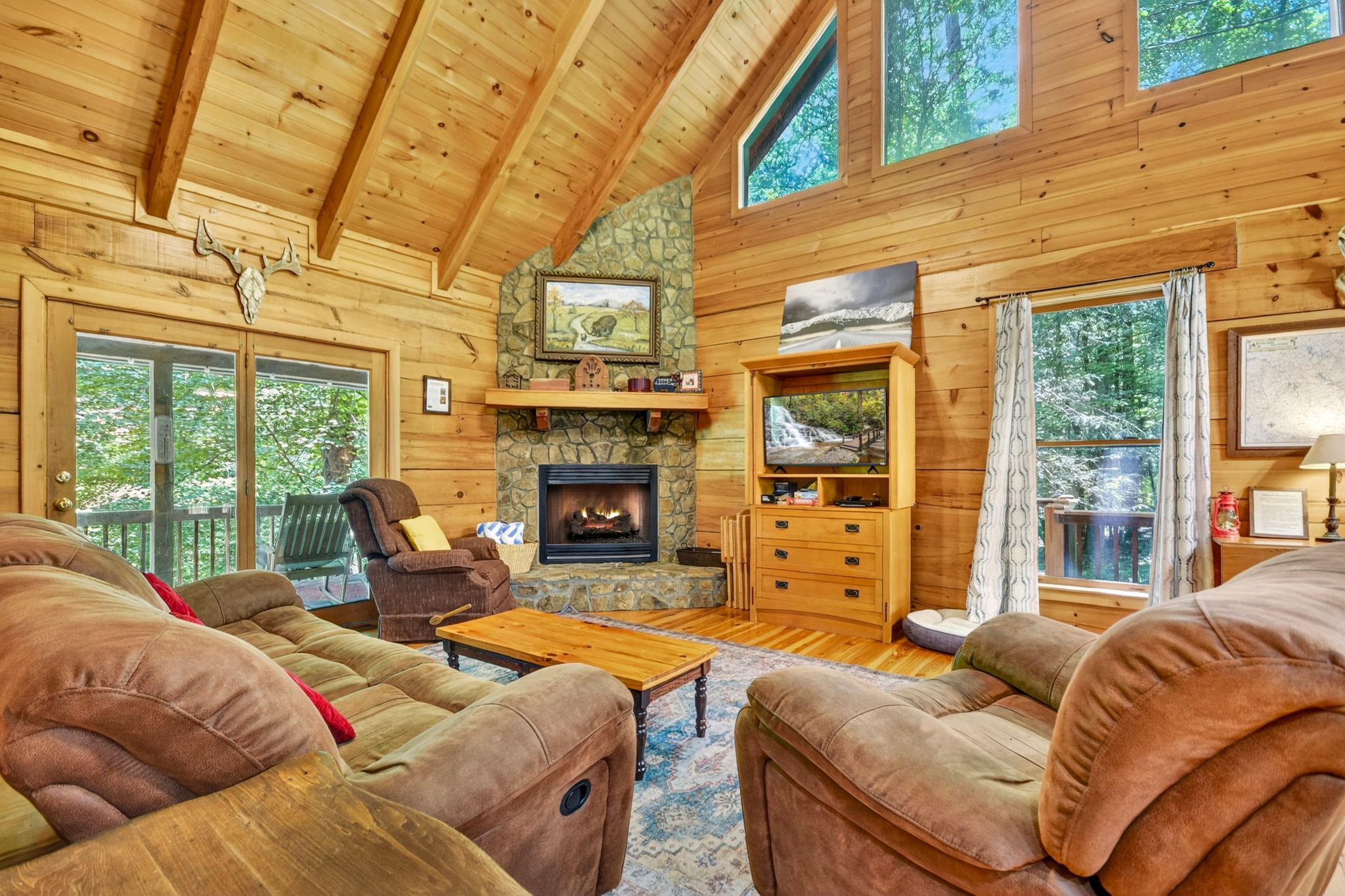 Inside, the vaulted ceiling and bright windows in the living room create an airy and inviting atmosphere, where a stone-encased gas fireplace adds warmth on cooler days. Hungry? Cook with ease in the fully equipped kitchen, complete with a drip coffeemaker, Keurig, and stovetop kettle, then dine or play board games surrounded by wooded views.