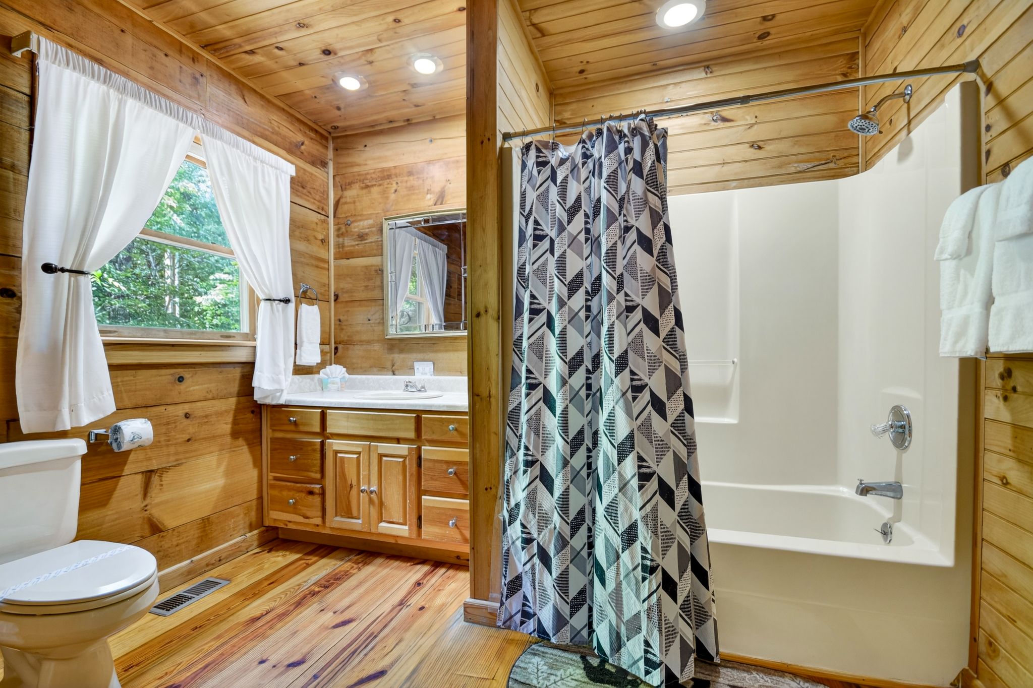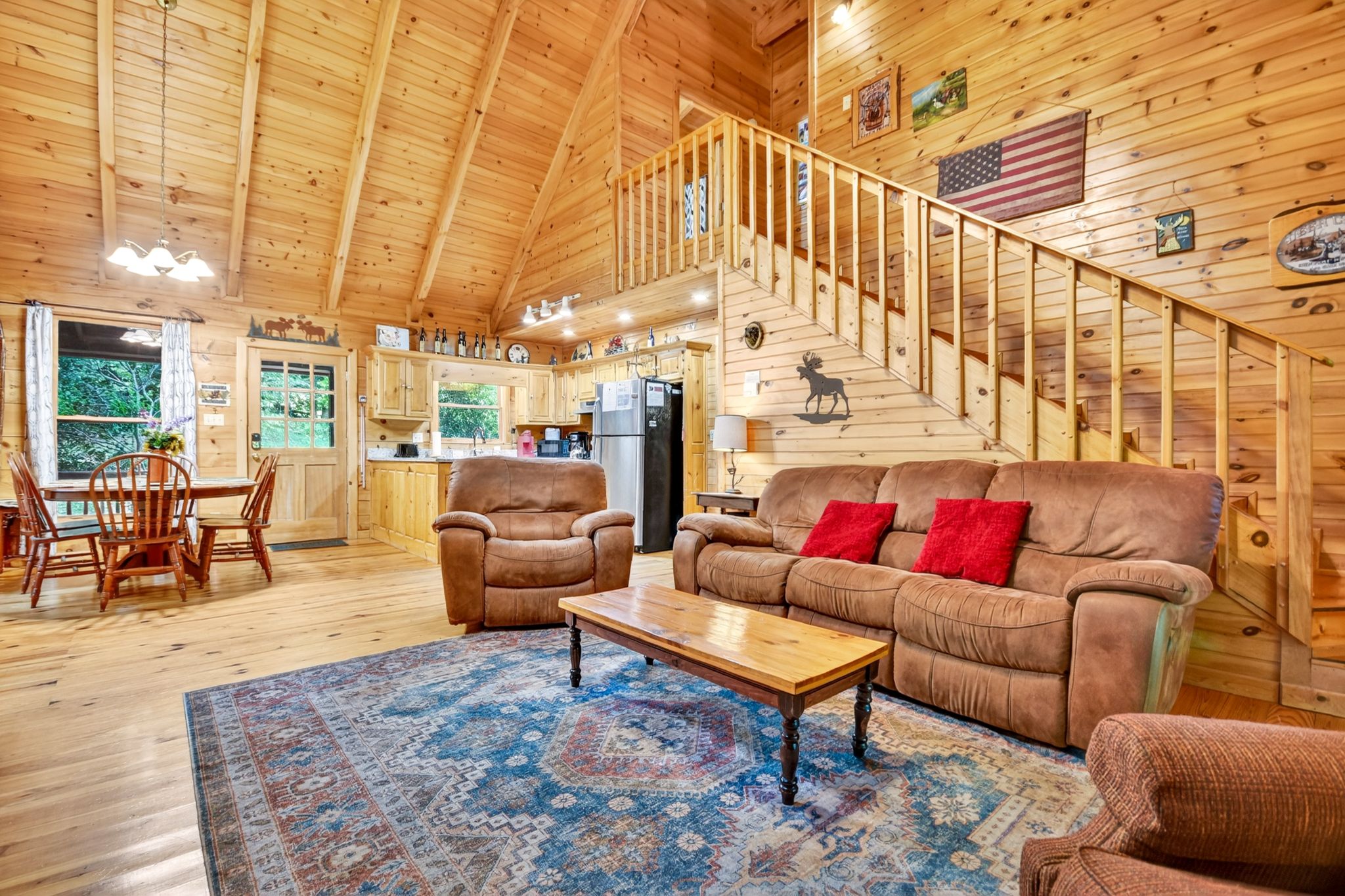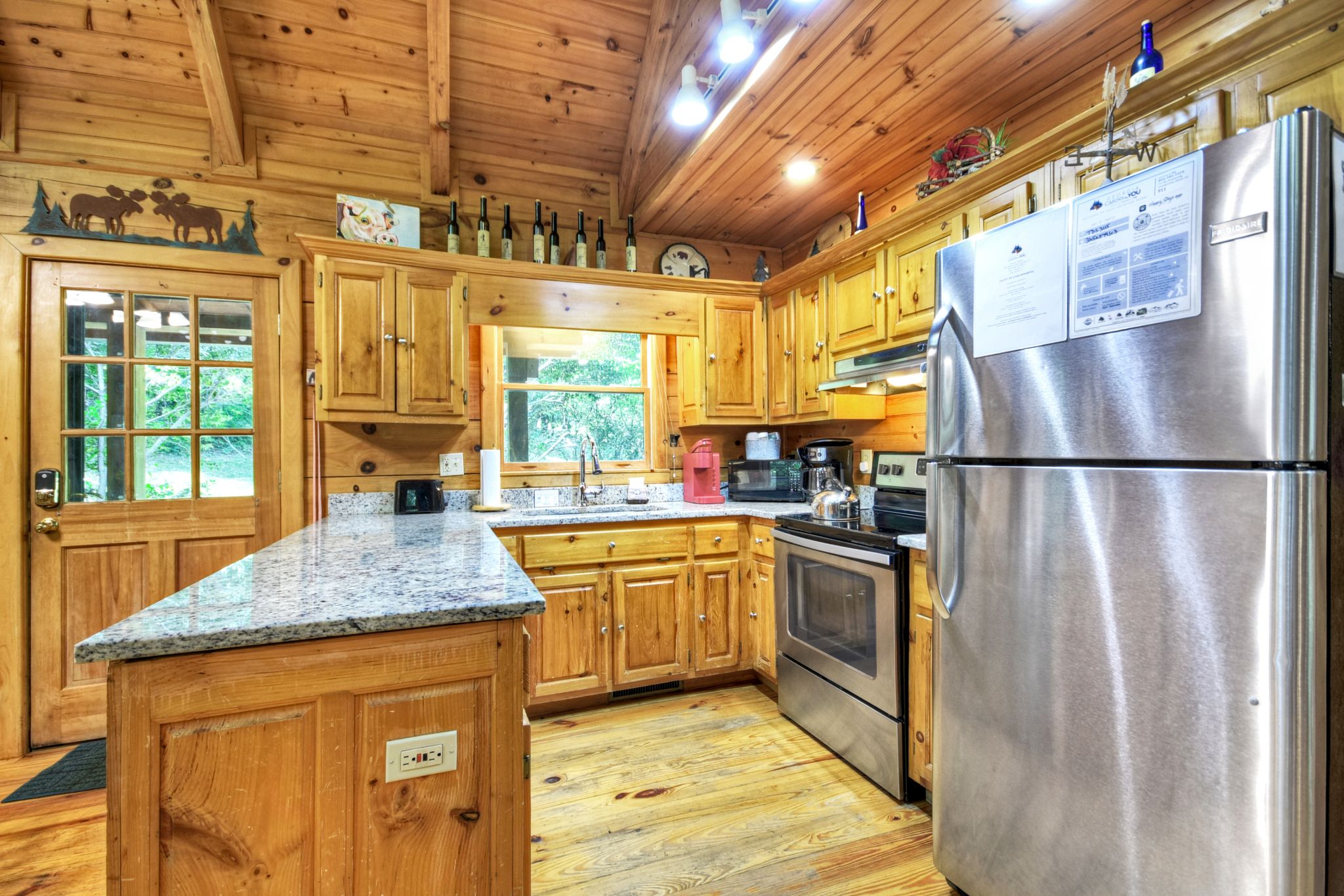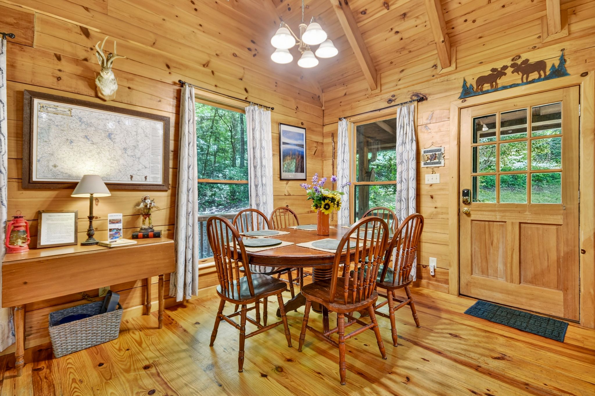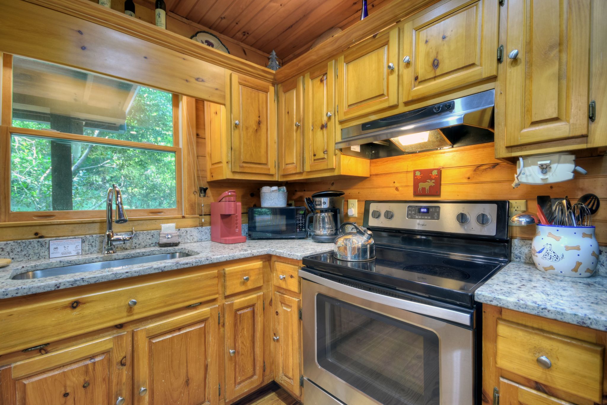 Inside, the vaulted ceiling and bright windows in the living room create an airy and inviting atmosphere, where a stone-encased gas fireplace adds warmth on cooler days. Hungry? Cook with ease in the fully equipped kitchen, complete with a drip coffeemaker, Keurig, and stovetop kettle, then dine or play board games surrounded by wooded views.