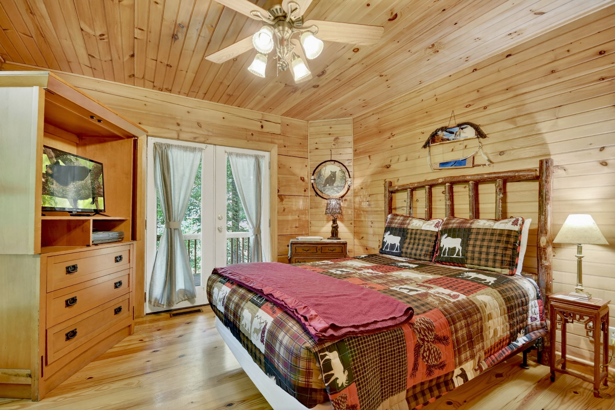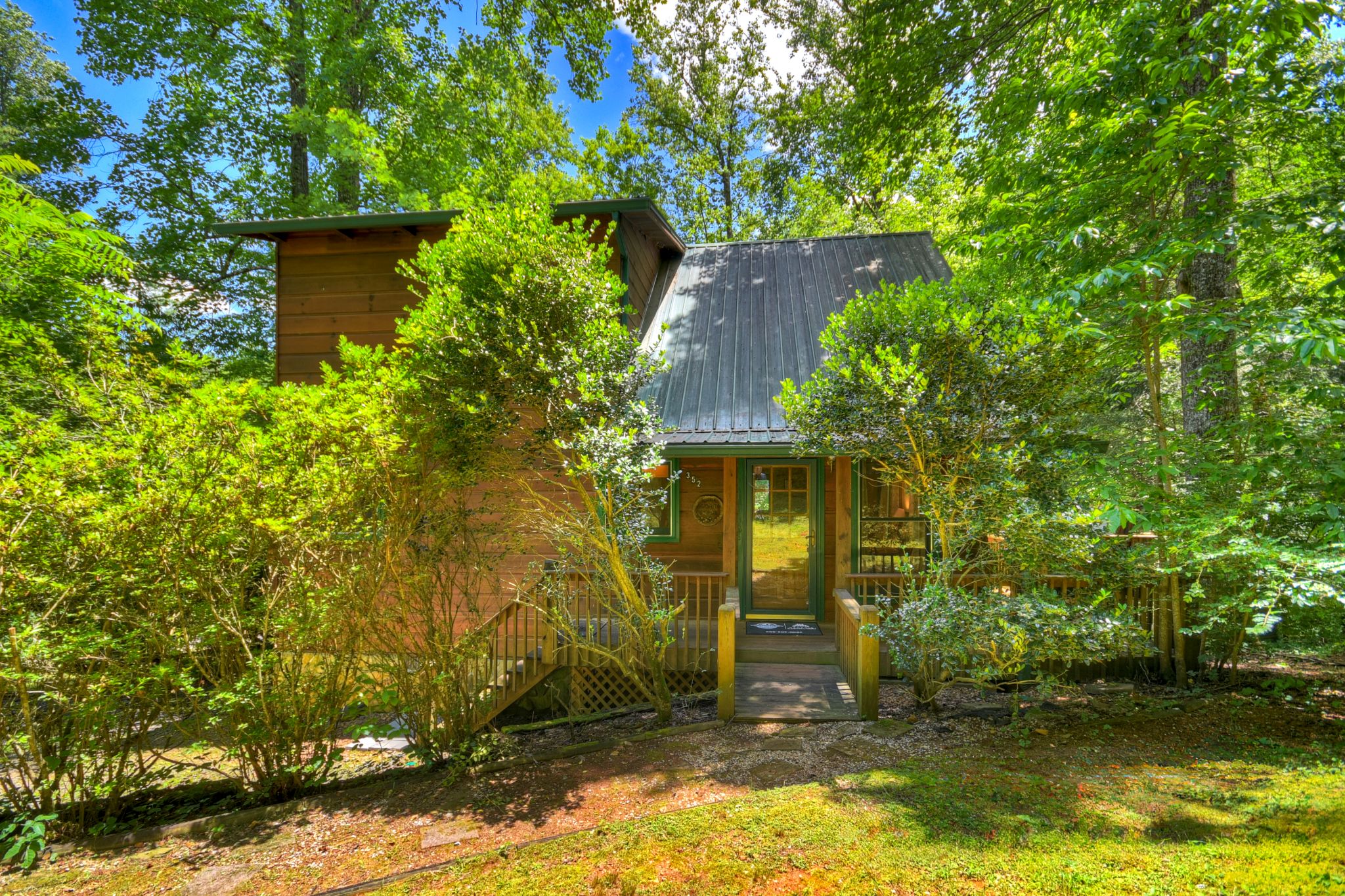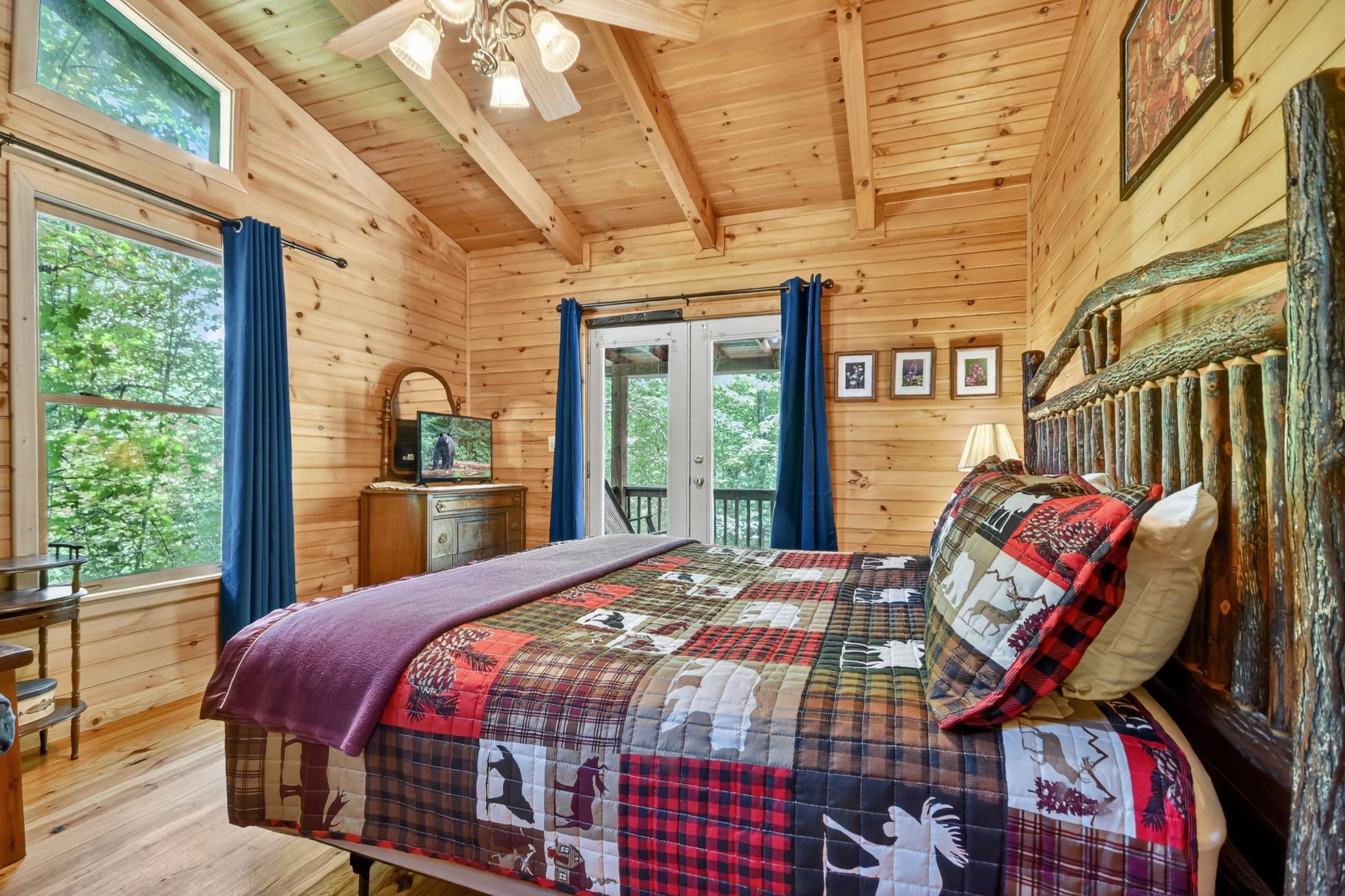After a day of playing golf at Old Toccoa Farm or shopping for antiques in town, curl up with a movie on the TV and DVD player, or head to your bedroom — each with direct deck access, tree-studded vistas, and its own TV. The Blue Ridge cabin rental sleeps up to 6 guests across a king bed, queen bed, and futon, with 2 full bathrooms and plenty of cozy nooks to relax. The private balcony off the primary suite is perfect for quiet mornings, while the lush grassy yard provides a great space to walk your dog.
