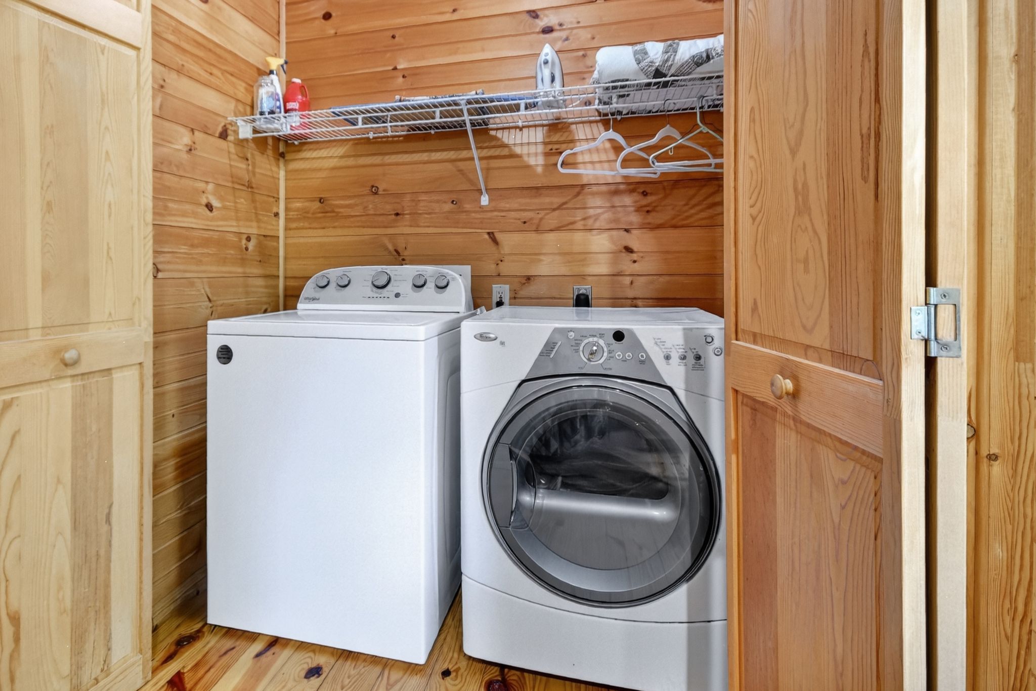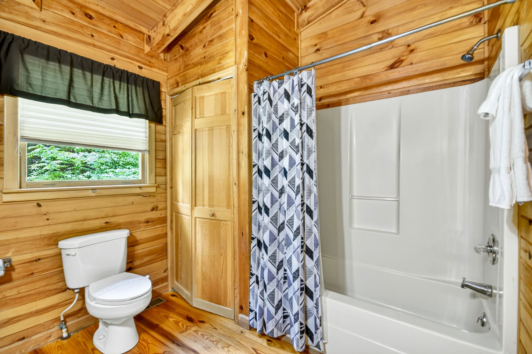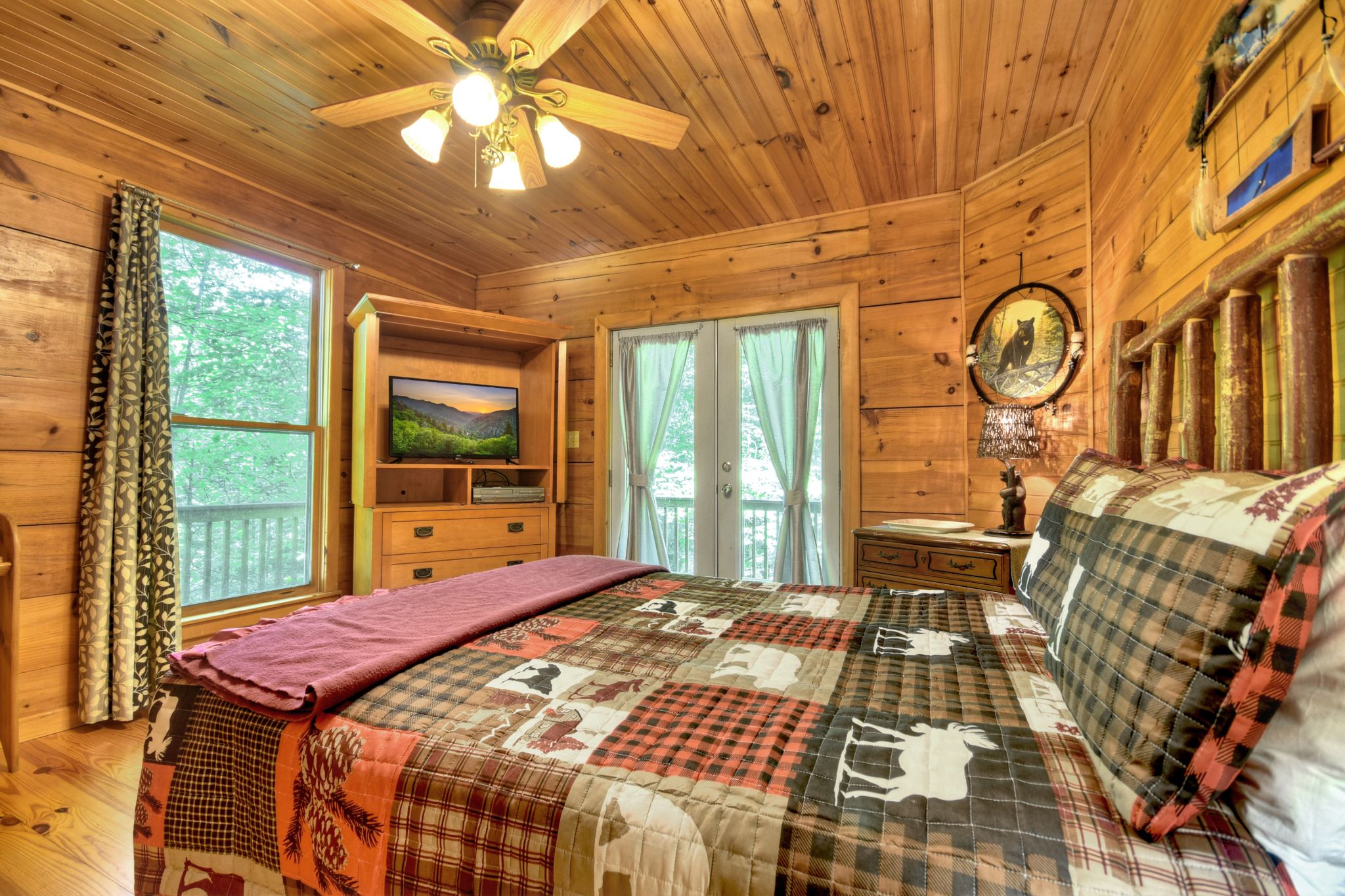 After a day of playing golf at Old Toccoa Farm or shopping for antiques in town, curl up with a movie on the TV and DVD player, or head to your bedroom — each with direct deck access, tree-studded vistas, and its own TV. The Blue Ridge cabin rental sleeps up to 6 guests across a king bed, queen bed, and futon, with 2 full bathrooms and plenty of cozy nooks to relax. The private balcony off the primary suite is perfect for quiet mornings, while the lush grassy yard provides a great space to walk your dog.