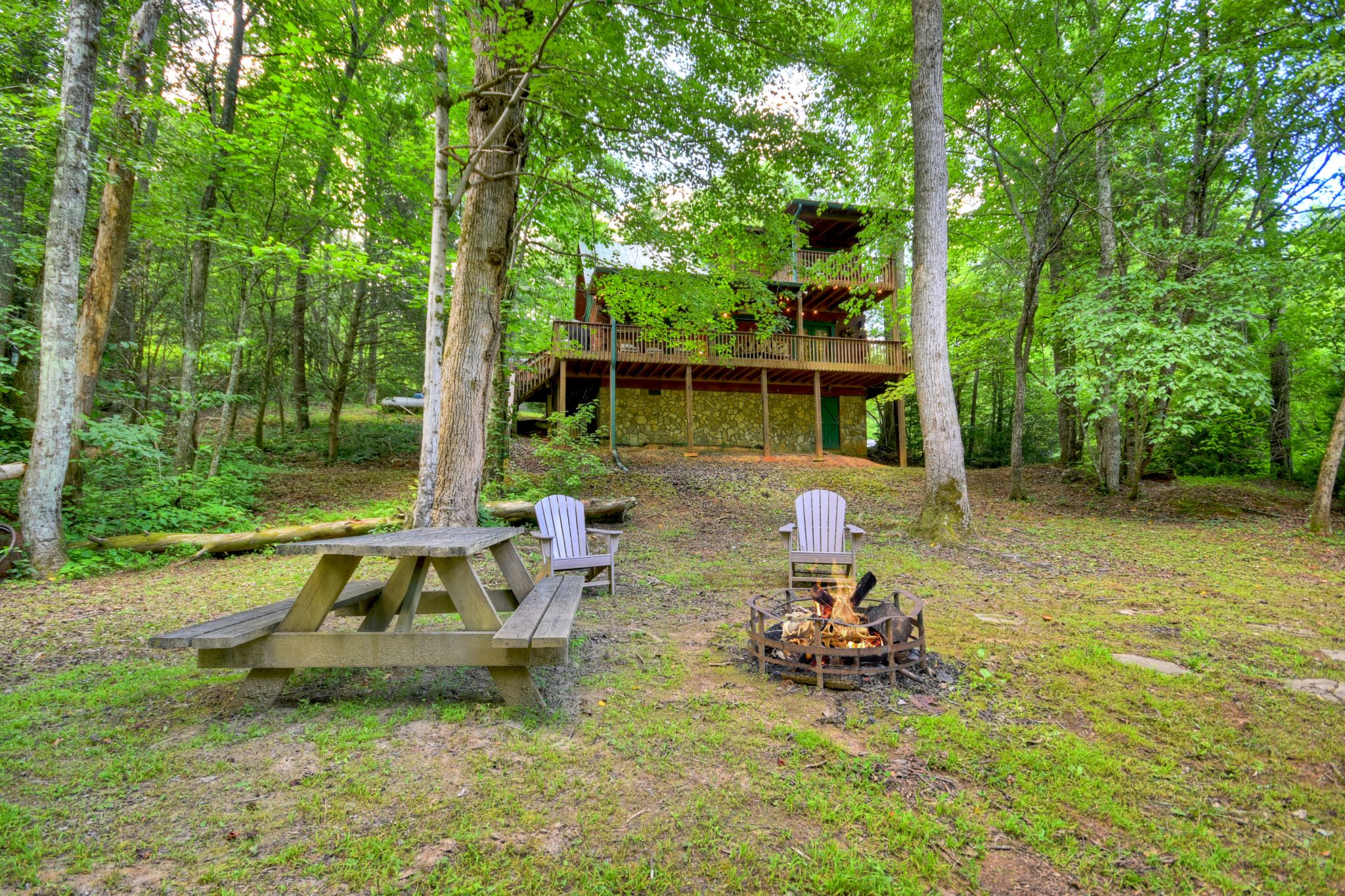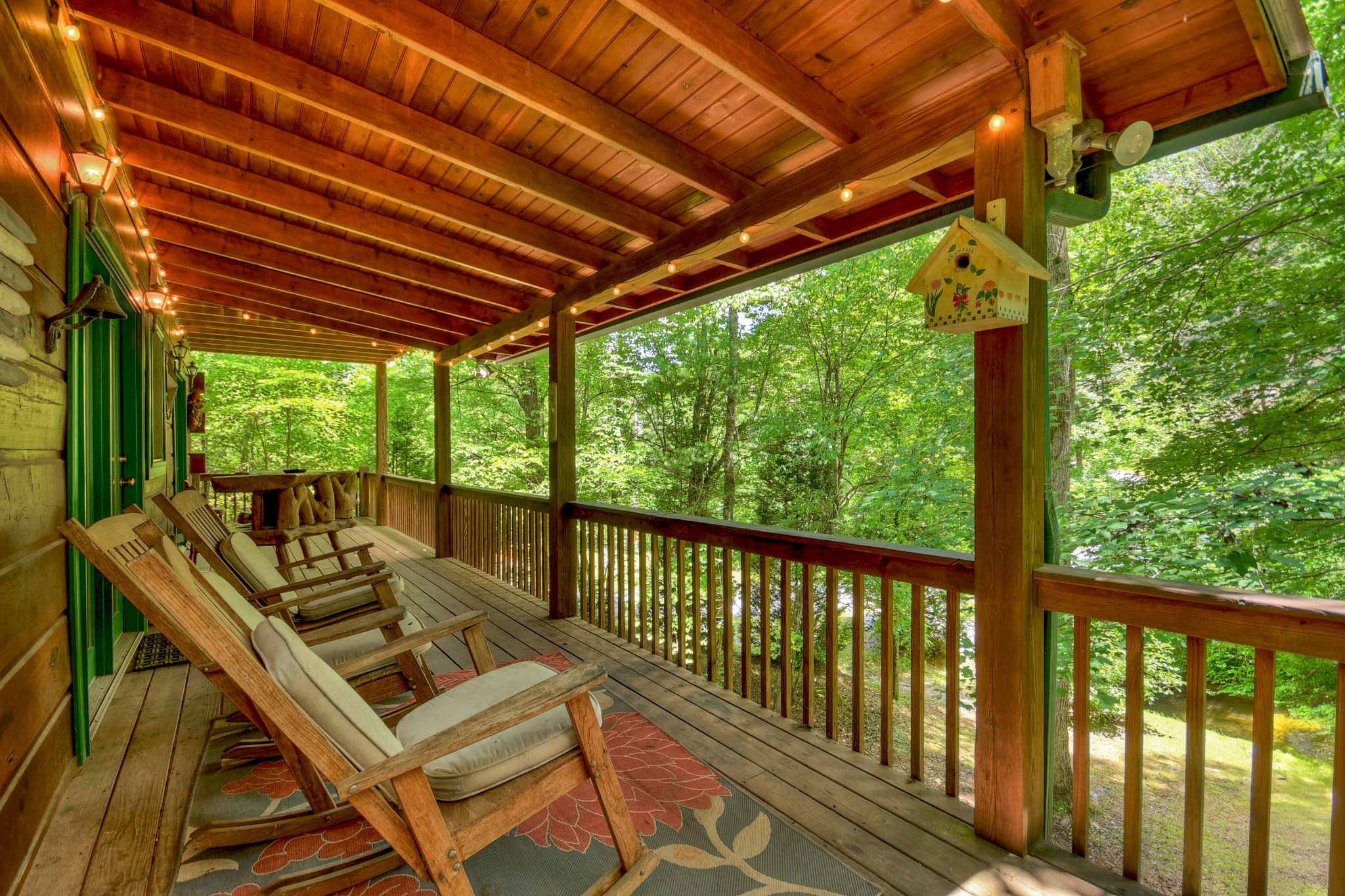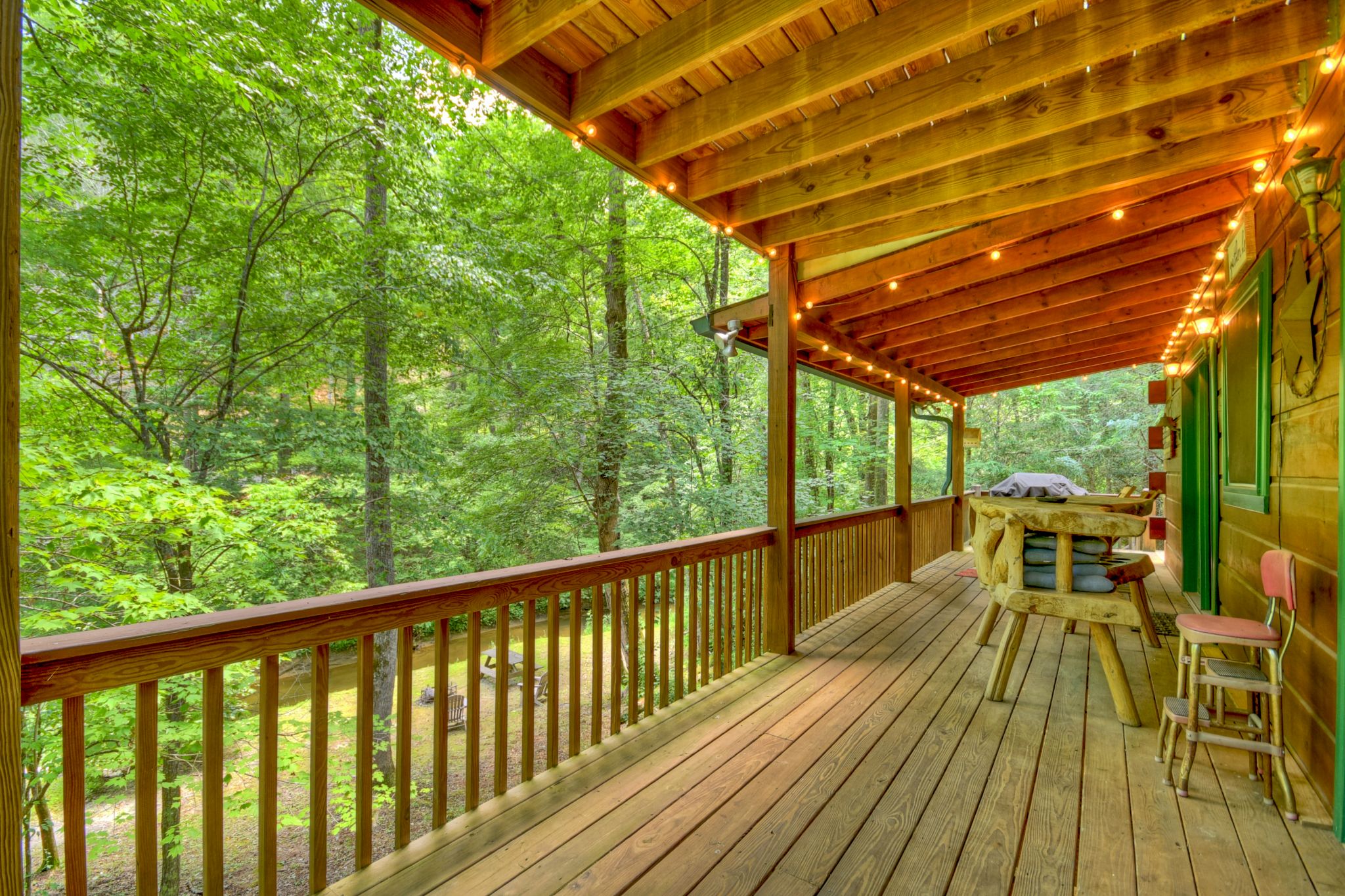 Tucked beside the tranquil waters of Ritchie Creek, this charming waterfront cabin rental in North Georgia blends the beauty of the great outdoors with comfort and warmth inside. From the wraparound deck strung with lights to the bubbling hot tub overlooking the creek and treetops, every space encourages guests to slow down and reconnect in the Blue Ridge Mountains.