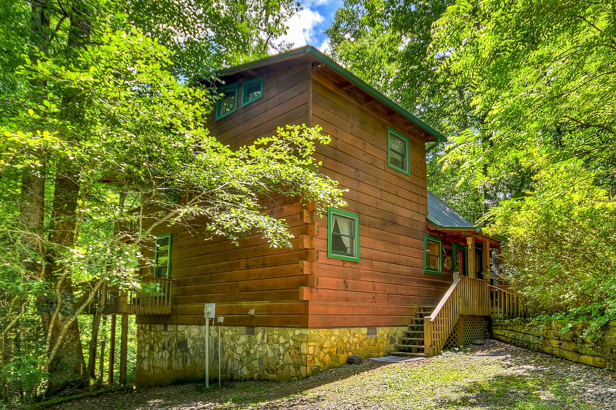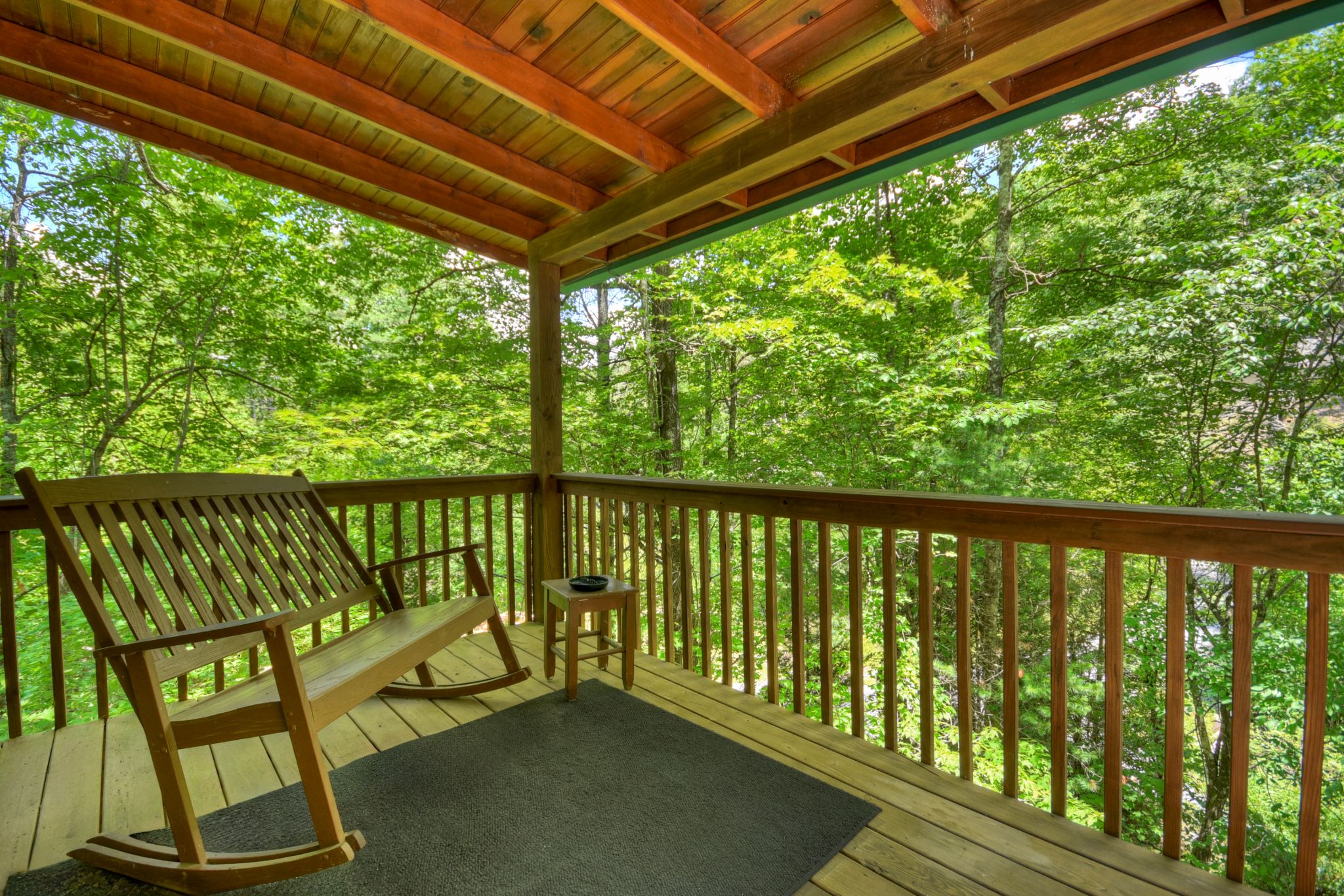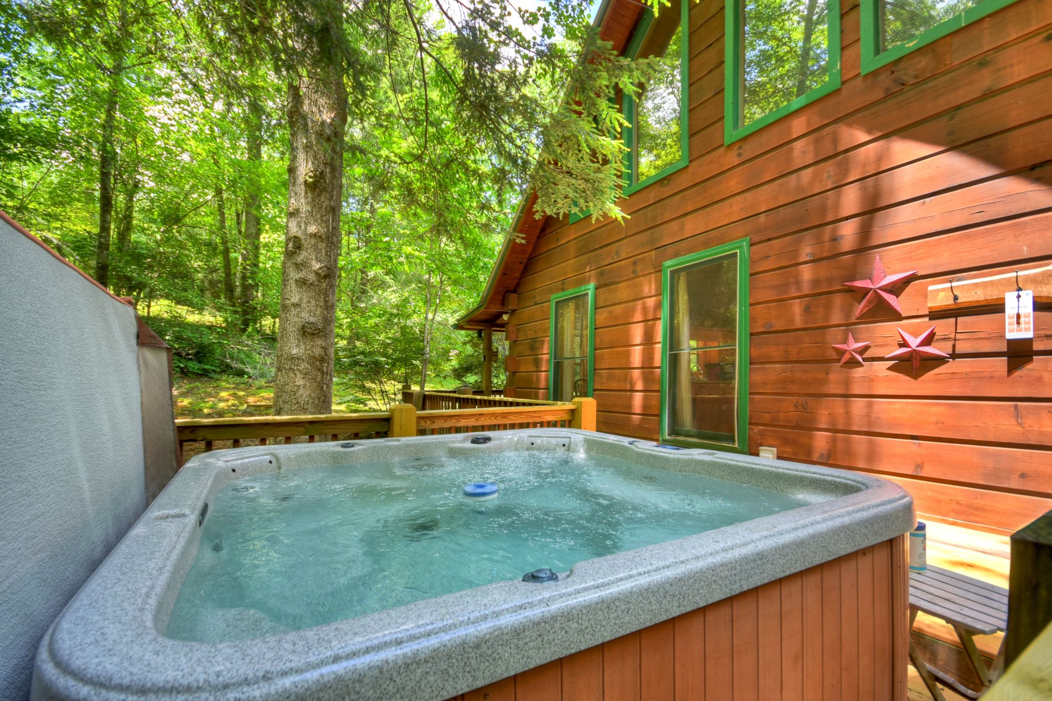 Tucked beside the tranquil waters of Ritchie Creek, this charming waterfront cabin rental in North Georgia blends the beauty of the great outdoors with comfort and warmth inside. From the wraparound deck strung with lights to the bubbling hot tub overlooking the creek and treetops, every space encourages guests to slow down and reconnect in the Blue Ridge Mountains.
