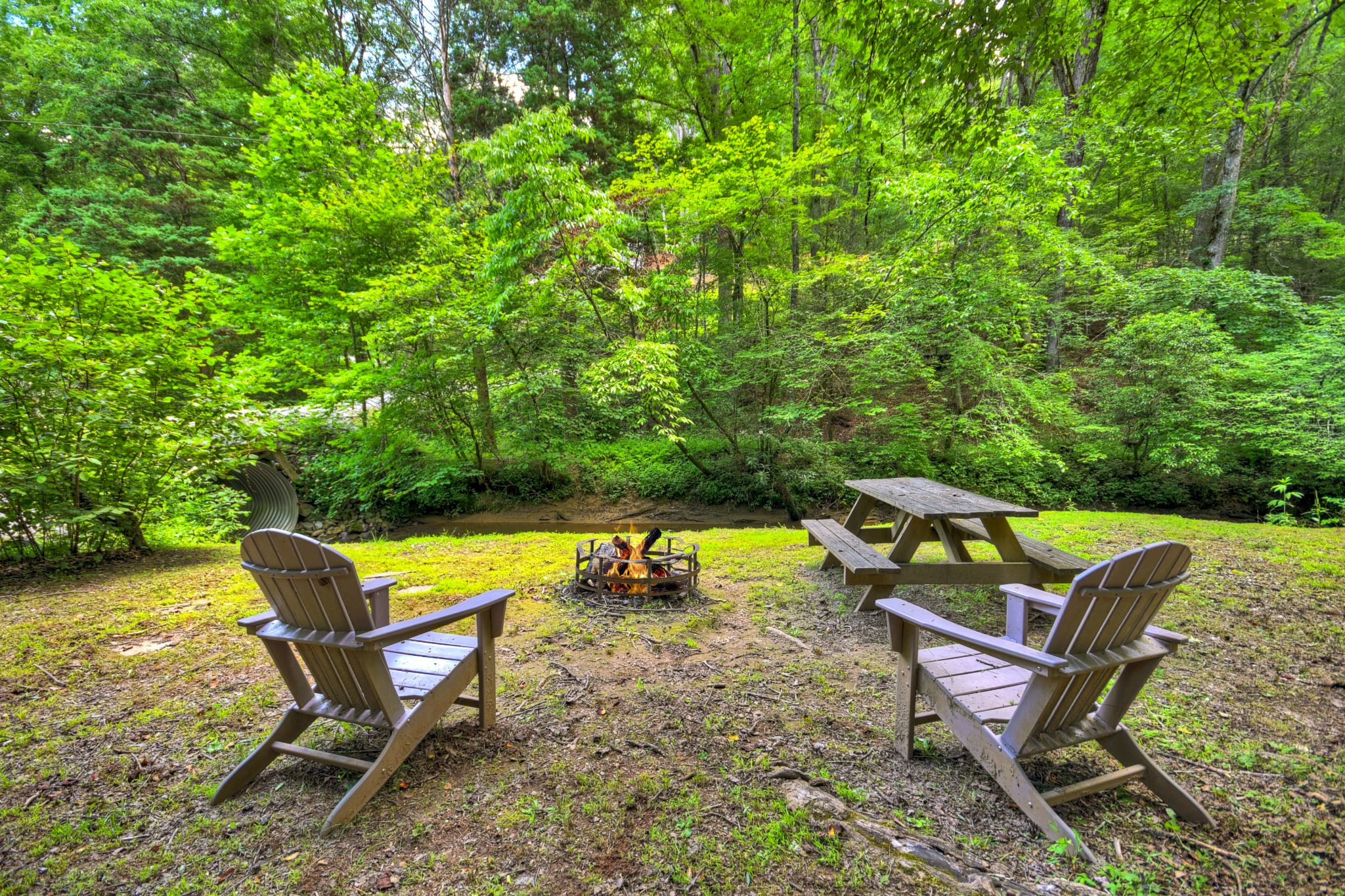 Located about 14 miles from downtown Blue Ridge and within reach of outdoor adventures in the Chattahoochee National Forest, Blue Ridge Mountain Trail Rides, and the towns of McCaysville and Ellijay, this creekside cabin is a memorable and serene mountain escape. Sip morning coffee in a rocker, gather around the firepit for marshmallow roasting, or watch the creek drift beneath the nearby bridge — all with your pup by your side in this pet-friendly retreat.